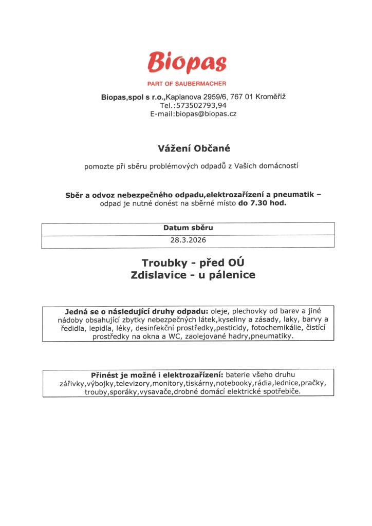 Vážení občané, zveme vás k účasti na sběru problémových odpadů, který se uskuteční 28. března 2026. Sběrná místa jsou stanovena na dvou lokalitách: před Obecním úřadem v Troubkách a u pálenice v Zdislavicích. Všechny nebezpečné odpady, jako jsou oleje, plechovky od barev, kyseliny a další chemikálie, je nutné přinést do 7.30 hodin. Také můžete odevzdat elektrozařízení, jako jsou baterie, televizory, lednice a drobné domácí spotřebiče. Společně se postaráme o bezpečné a ekologické odstranění odpadu.
